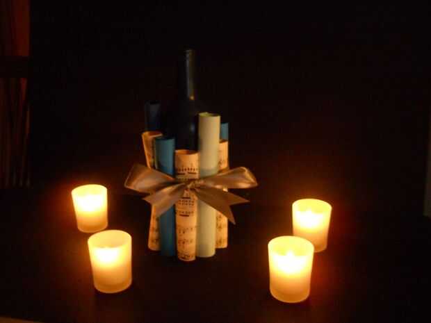 JIC Soy una novia DIY y me llevó para siempre con un pedazo de centro que me ha gustado. Esta particular boda es con temas de teatro, así que quería algo reflexionar. Esta central utiliza hojas de música vieja, cartón y botellas de vino.