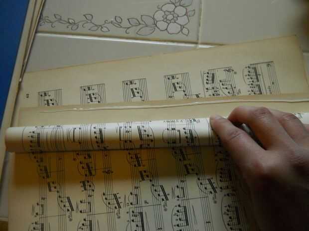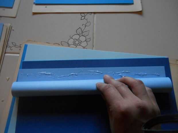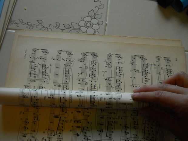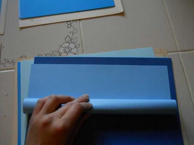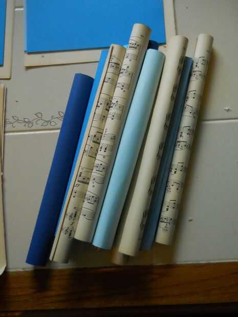 Estoy usando cartulina. El espesor hace difícil rodar, pero se levanta y se ve mejor en el final. Yo alternaba entre tonos de azul, porque azul es mi color favorito. También estoy usando papeles vintage música mi mejor amigo en una venta de garaje.