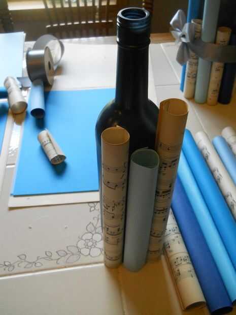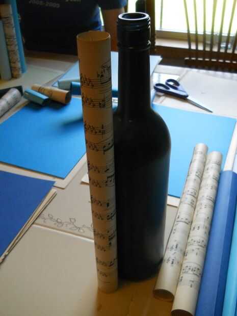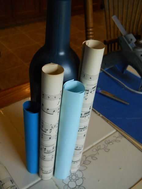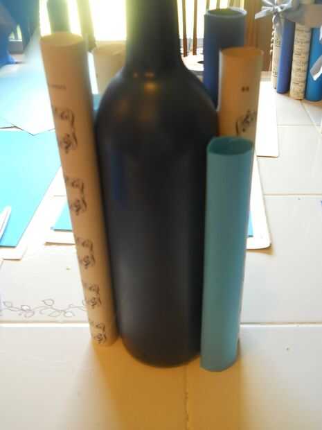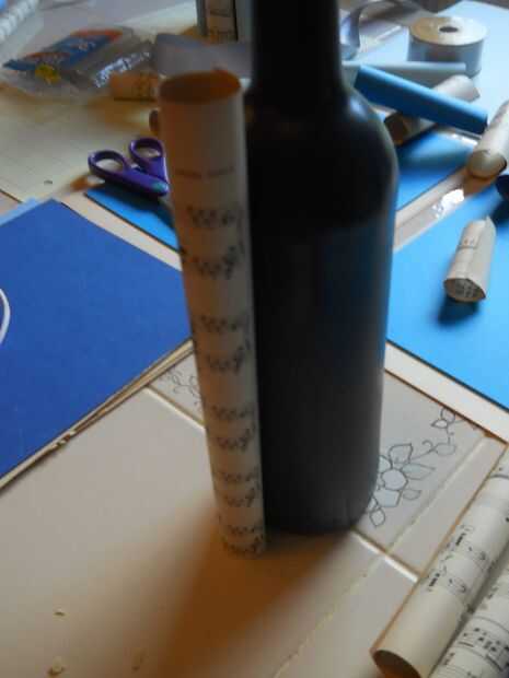 Primero - coloque un rollo de papel contra la botella. Mina corté justo por encima de la curva en el cuello de la botella. Como hacia otros rollos, también ajusté las alturas en diferentes. Me ha gustado el look.