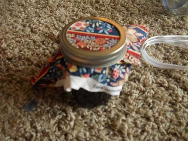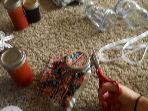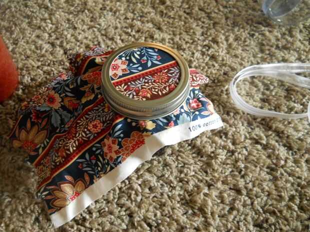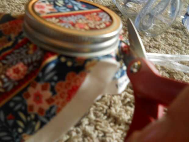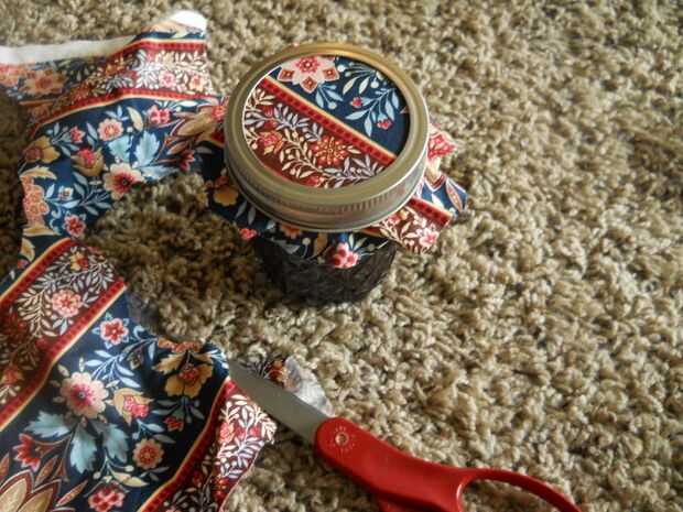 Primero, corte un cuadrado pequeño de tela ligeramente más grande que el tarro. Coloque esta entre la tapa sellada y la tapa de rosca. Apriete el tapón de rosca. Siguiente, recortar los bordes. Me pareció bueno dejar una muesca pequeña alrededor del borde. Parecía bastante. Pero estar prevenidos, utilice unas tijeras afiladas. La tela puede fray lo contrario. Si adquieres se deshilache la tela, no te preocupes. Utilice pegamento básico en el borde para evitar que se deshilache más.