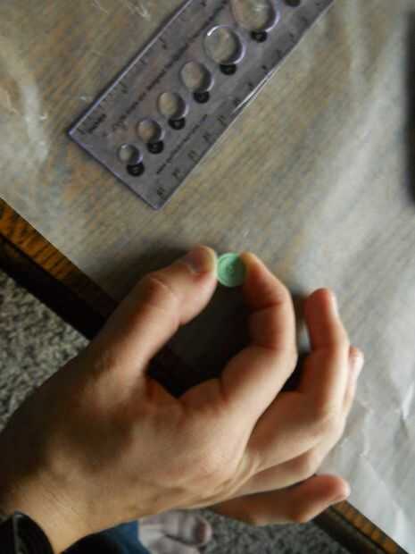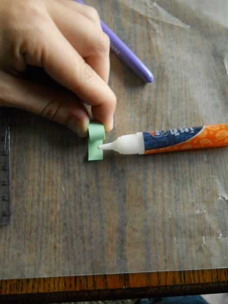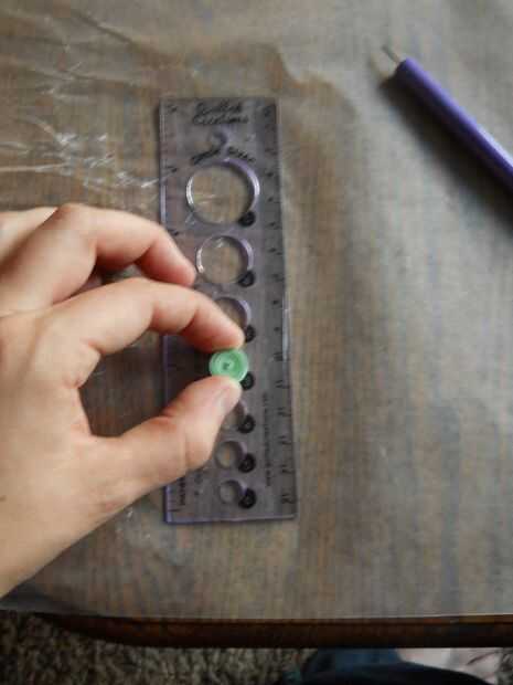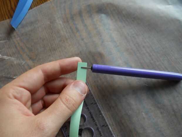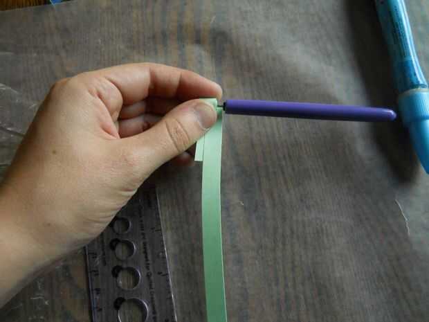 Escoger el color del centro de la flor. Elegí un pastel verde. Deslice el extremo del papel en la ranura de la herramienta de quilling. Deje aproximadamente 1/8" en el otro lado de la herramienta, lejos de usted. A continuación, gire la herramienta hacia usted. Esto rollos el papel sobre sí mismo y comienza a formarse. Pongo dos piezas quilling en mi centro. Para ello, rodando la primera parada de papel aproximadamente 1/4" del extremo. Deslice el siguiente papel en el rollo entre la cola y el rollo. Continuar rodando. Deslice suavemente el rollo de la herramienta quilling. Coloque el rollo en el aparato de medición. Permitir que el rodillo para ampliar a su tamaño. Retire el rollo de la herramienta medición y tire ligeramente al final. Colocar pegamento en el extremo del rollo de nuevo juntos.