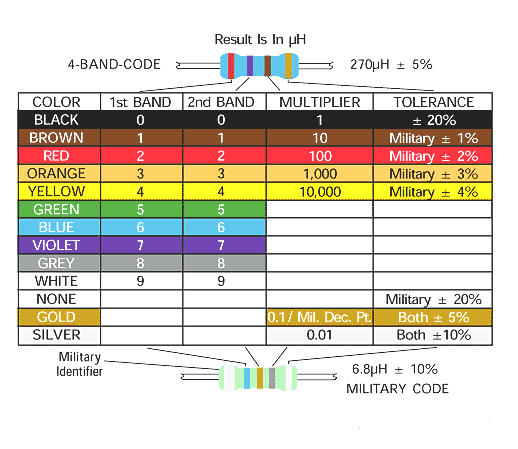 Los códigos de color de inductores son idénticos a la de una resistencia así que si estás familiarizado con resistencias esto debe ser muy fácil