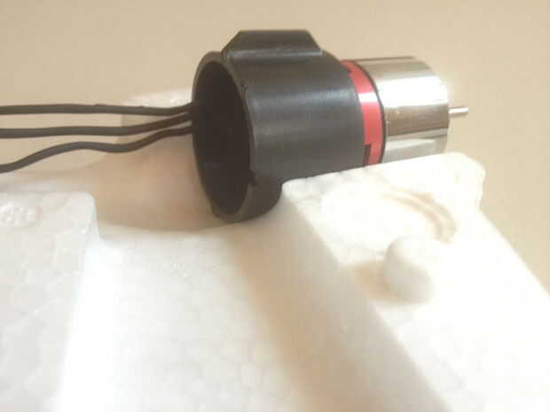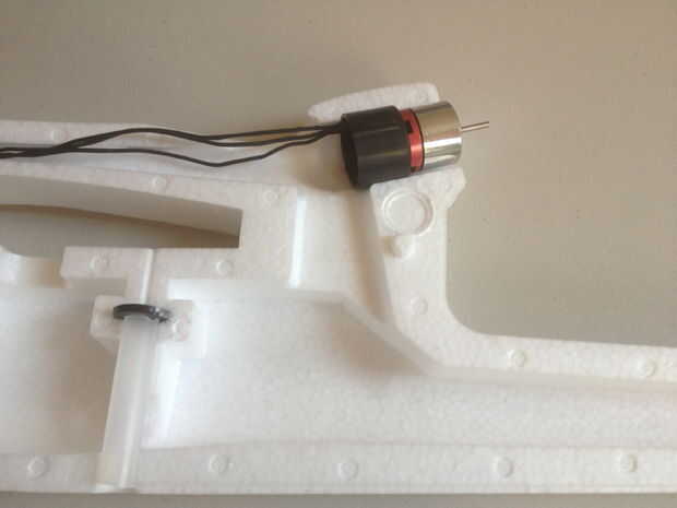 Atornille el motor a la bancada que viene en el kit. Agregue el pegamento a la espuma, donde el Monte se colocará entonces coloque el montaje en las ranuras diseñadas.   ADVERTENCIA: Asegúrese de que la ranura de la montura se enfrenta hacia abajo para el ángulo de empuje adecuado.