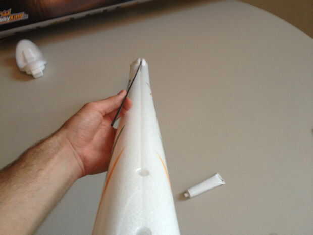 Agregar el pegamento en la ranura en la parte inferior trasera del fuselaje.  Luego coloque el larguero de fibra de carbono, se desliza de back-end en primera, en la ranura.