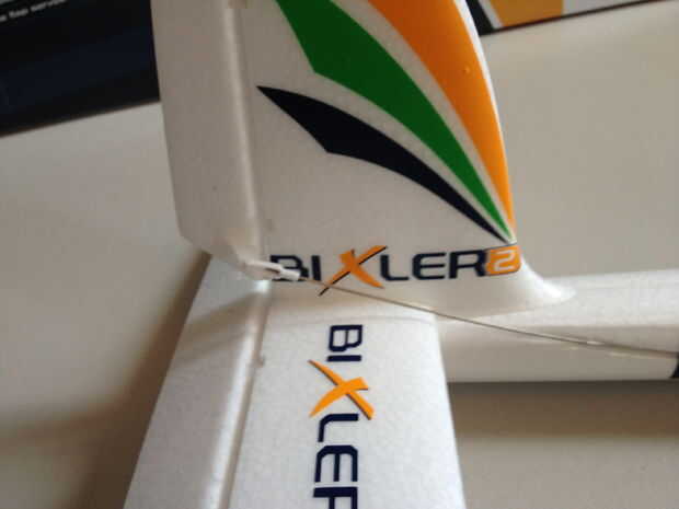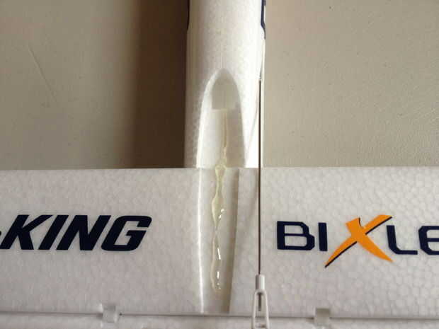 Agregue el pegamento a la muesca delante del estabilizador horizontal, como se ve en la foto y fije la cola vertical del fuselaje. Conectar la bocina de control a la barra de acero para la superficie de control.
