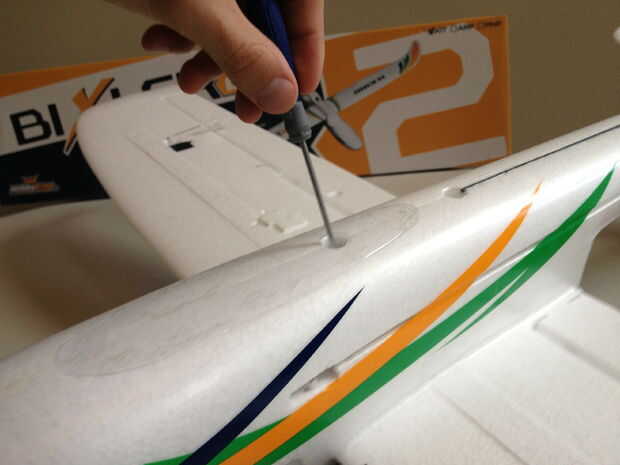 Inserte la varilla de fibra de carbono en el ala derecha y ajuste de la derecha en la ranura en el fuselaje.  Luego, hacer lo mismo para el ala izquierda para correr los cables en el fuselaje.  Luego coloque los tornillos en los agujeros en la parte inferior del fuselaje.
