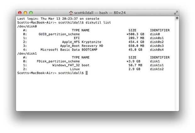 Usted ha visto esto antes, pero ahora tenemos algunas ligeras diferencias en el nombre de la partición de la tarjeta SD. No convertir al nombre del dispositivo raw esta vez, sólo tiene que utilizar /dev/disk1