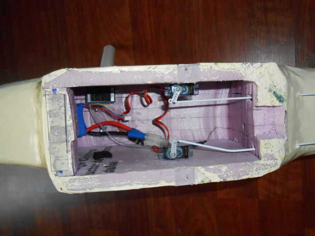 El ala está hecho de la misma hoja de la espuma de DOW/color de rosa que el fuselaje se hace de. Es un verdadero ala airfoiled. Es muy fuerte por sí mismo, pero usted puede Agregar un mástil de ala. Usar un 1/4 '' (6 mm) Espiga de madera de la ferretería local.
