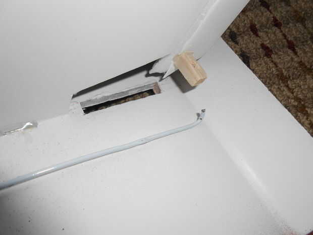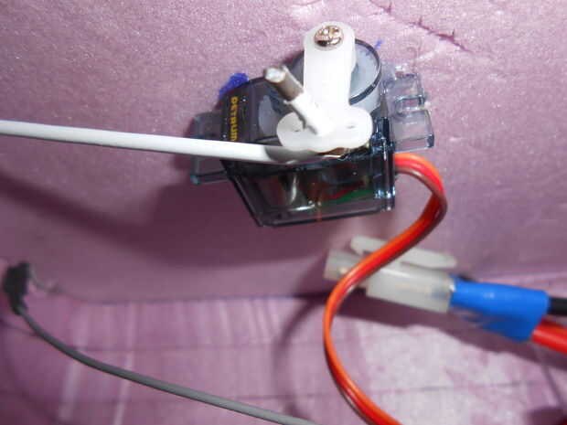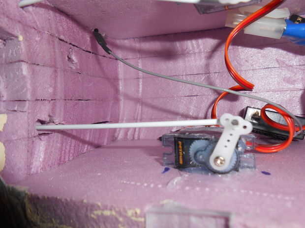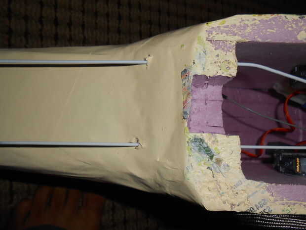 Como mencioné en el paso de materiales, usé una percha de alambre para barras de control. Para que se vean limpia, asomó por la parte posterior de la bahía electrónica. También puede incrustar los servos fuera de la bahía de la electrónica de fácil acceso, pero quería el plano para ver limpiador. Empiece con un trozo de alambre de 25'' de largo. Asegúrese de que está recto. Nos reducirá esto unas pocas pulgadas una vez que están situados, pueden necesitar múltiples perchas. Primero hacer un 90 grados de la curva en un extremo del cable. La sección doblada adjuntará a su cuerno de control en el timón. A continuación, meter un agujero en su fuselaje, como se muestra en la imagen. Usted puede calentar el extremo de la percha, y se funda como pasa a través, que es grande ya que proporciona una superficie sin fricción. Usted hará este paso otra vez para el ascensor, pero en el otro lado. Deslice el cable por el agujero (el recta final de curso) y luego coloque el extremo doblado a la horn. Estimar la longitud de la curva hará que en el otro lado para sujetar el cable al brazo del servo. Cortar a la longitud apropiada, y listo. Repita para el elevador, asegurándose de que sus curvas están en las derecha las indicaciones.