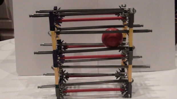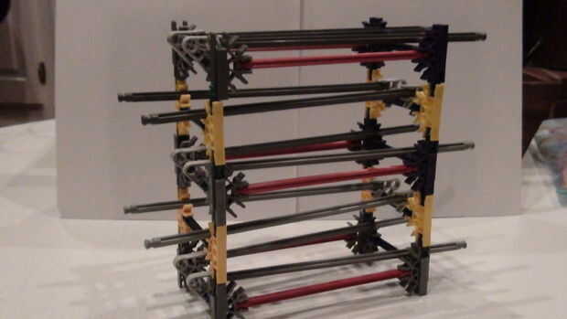 no creo esto pero me pareció como un elemento de máquina de la bola buena. Un sistema de educación K'Nex tenía instrucciones para ello y lo llamó el "tornillo de Arquímedes". Si poner una bola en la parte superior de la tolva y añadir un motor,