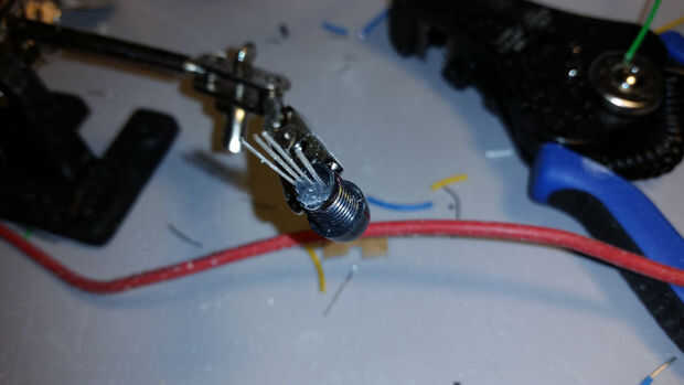 5. usted podría utilizar conectores de horquilla para fijar el cable de conexión a su botón para los puentes a la Junta, pero no tengo ninguna por lo que sólo soldados a los terminales