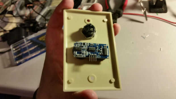 3. montar el sensor de distancia por apilamiento goma 2 anillos directamente en el emisor o receptores como espaciadores para tener en cuenta la altura del reloj en el frente de la Junta, entonces empujado a través de los orificios que cortar y luego añade una junta tórica más para mantener en su lugar. Asegúrese de que los pasadores de punto hacia abajo para que no se en el camino del botón de montaje.