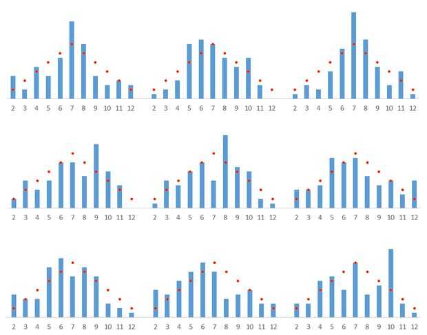 Lanzar dos dados de seis caras produce uno de los 36 resultados diferentes, pero porque Catan utiliza la suma los totales resultantes del 2-12 tienen diferentes probabilidades de que ocurra, como se muestra arriba. Hay sólo una manera de rodar un 2, pero 5 maneras diferentes de balanceo en un 6. En el juego, los números tengan pepitas de uno a cinco, y representan la oportunidad en 36 de ese recurso en particular se producen en un roll determinado. Sin embargo, un juego típico consiste en un número finito de bobinas, y la distribución no se va a igualar lo anterior perfectamente. A veces, serán las desviaciones de los promedios que se indignación los jugadores. ¿Más de 12 años que 6s en un juego? ¿No 5s en un juego? Verás estos y peor. La segunda imagen muestra 9 simulaciones de 72 rollos (un número bastante promedio para un juego), con los puntos rojos que muestran la distribución predicha y las barras azules de los valores observados (hechos con Excel utilizando las funciones de aleatorio y contar.Si. Esta hoja de cálculo simple se anexa al final de este paso si usted quiere jugar con él; golpe solo "guardar" Si desea que una nueva distribución). Se ve todo tipo de desviaciones; como ejemplos, el "juego" en la parte superior izquierda dispone de 2 siendo rodado tanto como o más de 3, 5, 9, 10, 11 y 12. En la parte inferior derecha tiene que ser 10 en más de 6 y 8 juntos. En el centro tiene el ladrón dar vuelta encima de solamente 6 veces en todo el juego.