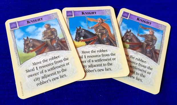 Caballero: caballeros son poderosos - protegen su más valioso azulejos, bloquear los azulejos más valiosos del otro jugador, le dan una tarjeta gratuita (así efectivamente sólo pasó dos tarjetas y negar una oponente!) y conseguir que en la carrera para el ejército más grande. Si el ladrón encuentra en uno de sus azulejos, casi siempre es correcto que un caballero * antes * rodando a menos que tenga 7 cartas (robando a alguien le dará 8 tarjetas, así que si luego saca un siete, perderás la mitad de sus tarjetas). Recomendaciones para colocar el ladrón están en el siguiente paso; siguen sin importar si la mueves en el rodillo de un 7 o jugando un caballero.