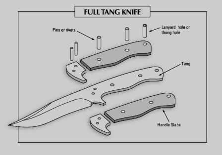 2. una espiga completa. Ver el cuadro para la referencia pero el tang es pieza de la manija de la hoja sí mismo. Te recomiendo la espiga completa porque en caso de total aislamiento y algún accidente ocurre romper el mango del cuchillo, puede mantener por una espiga completa y utilizarlo solo. También reparaciones de mangos de recambio están mucho más fáciles con la espiga completa.