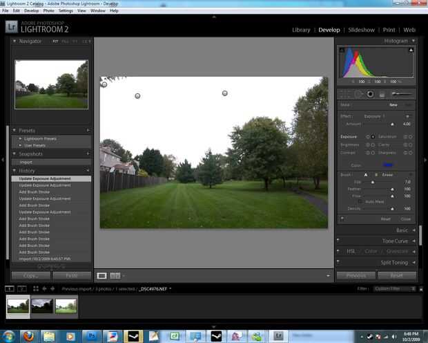 Haga clic en la primera imagen (ev 0 uno) que haga clic en la selección de opción "desarrollar" el pincel y seleccione exposición y todo lo que puede dar problemas en photomatix como astillas de nubes exc Retire