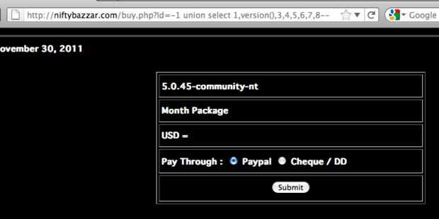 http://Vulnerable.com/goodies.php?id=10 Unión todos seleccione 1, versión (), 3,4,5,6,7, 8