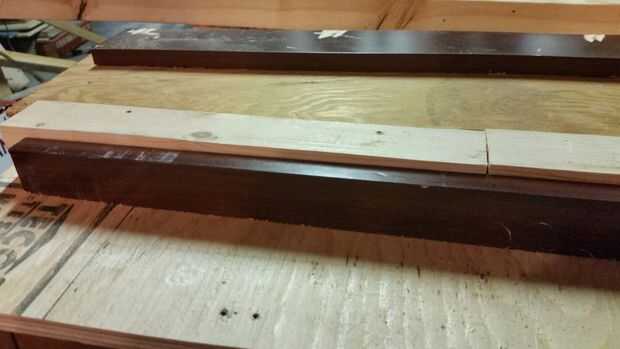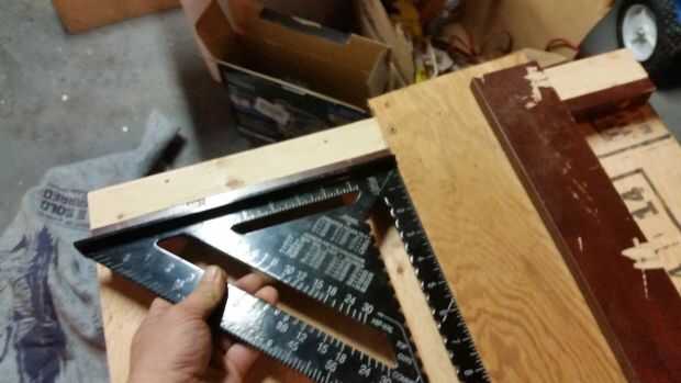 tenía algunas partes de un centro de entretenimiento y tienden a permanecer recto mientras permanecen secos. Lo primero que hice fue hacer una guía de la sierra usando una tira de 3" de la puerta de centro de entretenimiento 28" de largo y atornillado a la madera contrachapada de 1/4" a 32" de largo. Mi sierra tiene un desplazamiento de 4", así que corte la madera contrachapada de 8" de ancho, así que pude corte recto con la guía. Empecé con una 24 "× 24" hoja de madera contrachapada de 1/2". Corte un 2 x 4 11 1/2" de largo y utiliza a mi guía de la sierra para cortar por la mitad para hacer 23". Corte una tira de 2" del borde de la puerta 23" de largo y atornillados a los lados del corte de la 2x2s (ahora). Puso boca abajo para asegurarse de que la parte superior fue al ras, afianzado con abrazadera, hundido y les atornilladas. No ponga un tornillo cerca de la línea de corte o va a hacer un viaje para un disco nuevo. He atornillado abajo hasta un borde de la madera contrachapada y había atornillada hasta 48" de largo 2 x 4 al ras del borde opuesto. Atornilla a la guía de la sierra hasta el 2 x 2 asegurándose de dejar suficiente proyección de modo que yo puedo swing a 45 ° ambas maneras