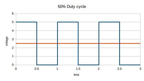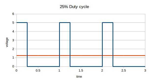 En otras palabras, el voltaje promedio puede ser escrito como el ciclo de trabajo multiplicado por la tensión de alimentación. Por ejemplo, un ciclo de trabajo del 25% sería 5v · 0,25 = 1.25v.