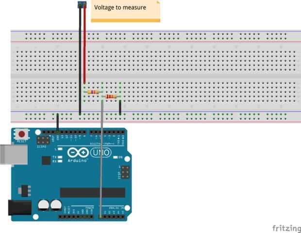 Conectar una resistencia (R2) de la tierra a la entrada analógica, luego conectar la tierra de la tensión a tierra de Arduino y luego conecte otra resistencia (R1) de la tensión a medir con el conector analógico. (ver imagen) Utilizar la fórmula anterior para calcular los valores de resistencia adecuados. Cualquier valor entre 10k y 100 k debería funcionar bien. Si la resistencia es demasiado baja, se dibujar demasiado corriente e influyen en la lectura mucho.