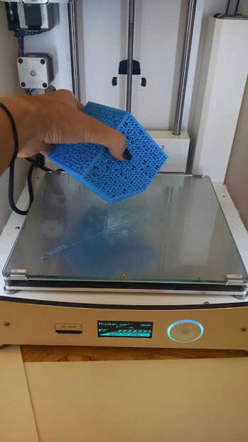 Tire suavemente de la pieza fuera de la plataforma. Asegúrese de que la plataforma se haya enfriado primero de lo contrario obtendrá algunas deformaciones en su impresión tirando fuera de la plataforma. Si es difícil retirar Retire la plataforma de cristal de la impresora girando las dos lengüetas de metal frente hacia usted.