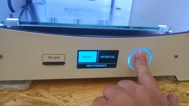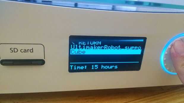 Inserte la tarjeta SD. Utilice la palanca para seleccionar imprimir y presione sobre el botón de alternar. Utilice la palanca para seleccionar el archivo. La impresora de primavera a la vida y alinearse sólo para hacer una pausa para precalentar durante unos minutos. Puede supervisar el progreso de la calefacción de la barra en la pantalla.