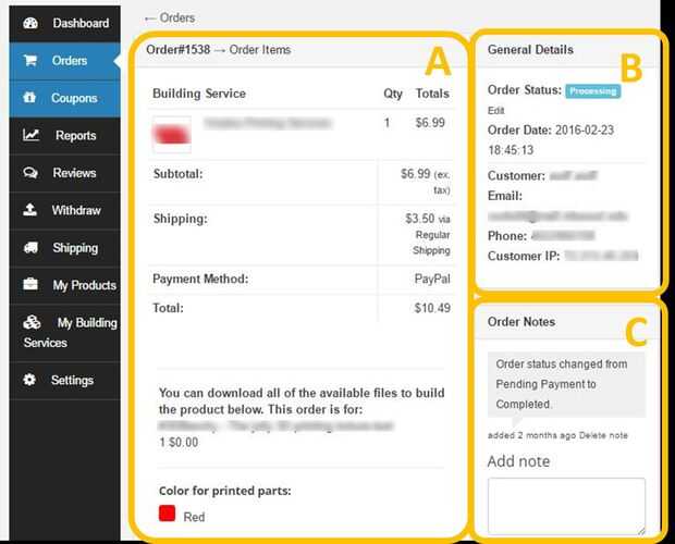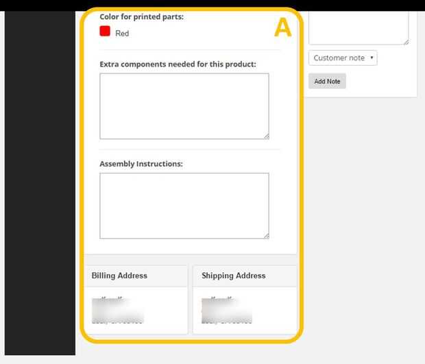 Resumen de A.: Aquí encontrarás un resumen de todo lo incluido en el orden. Esto incluye el servicio de construcción, el producto, el color de las piezas impresas 3D, así como el costo total incluyendo el envío. Usted también encontrará el link de descarga para todos los archivos de modelo 3D hacer el producto (recuerda, una de las grandes cosas sobre Print3d Mart es la habilidad de ser un fabricante de cualquiera los diseños). A continuación, usted encontrará las instrucciones de montaje, piezas adicionales y la dirección de envío del cliente.