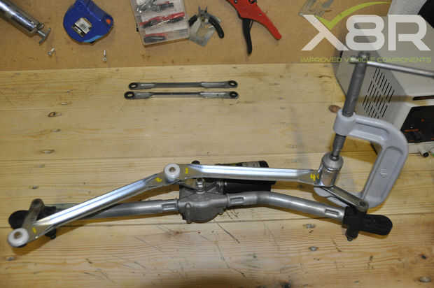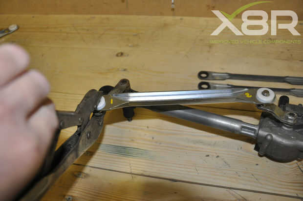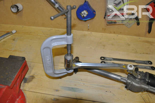 Inserte la varilla a la bola correspondiente articulación que tendrá que localizar el cojinete de plástico encima de la rótula, que el rodamiento puede fijarse entonces en como ilustrado y se deslizó a la rótula. Esto se puede hacer con los apretones de la mole como se ilustra, o bien con una abrazadera G y una toma levemente más grande en diámetro que el casquillo de plástico. Nuestro método preferido es la abrazadera G.