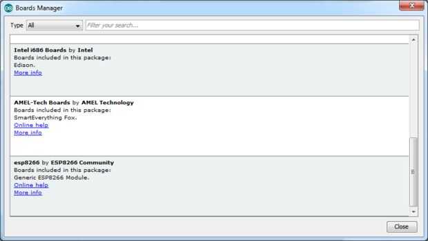 Desde el IDE de Arduino, herramientas -> Tabla -> Administrador de tablas como se muestra en la figura. Haga clic en Administrador de tablas. Desde la ventana del administrador de tablas, espere un rato para actualizar la lista y buscar "esp8266 por la comunidad de ESP8266 y haga clic en botón instalar.
