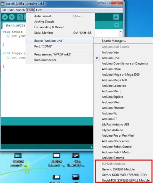 Ahora usted puede comprobar ESP5266 módulo haciendo clic en herramientas -> Tabla -> módulo genérico de ESP8266 como se muestra en la figura. Y usted puede probar el programa Blink.