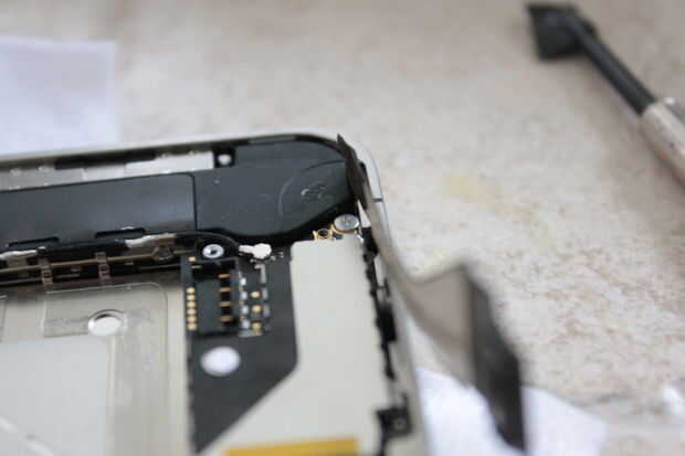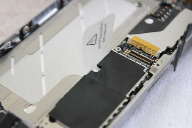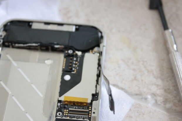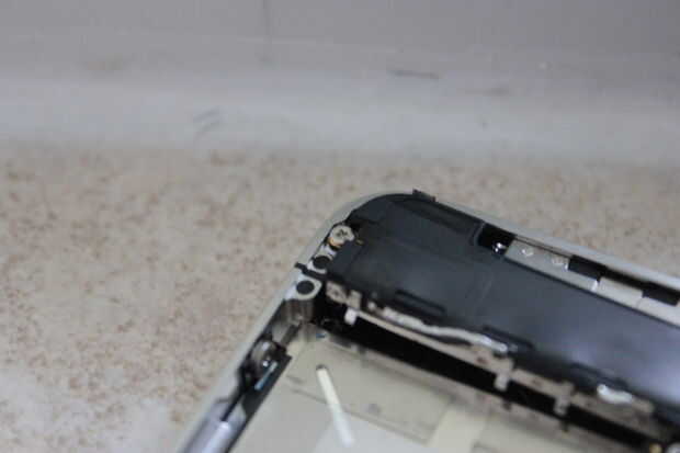Para este paso tienes que volver al conector pequeño bajo el escudo en el paso dos. Suavemente Retire el cable de cinta larga. Es vital que haga esto con cuidado porque esto puede rasgar fácilmente. Después de se pela lejos y colocación cautelosamente en su lado Quite los dos tornillos indicaron a continuación. Después de quitar cada tornillo uso un destornillador de cabeza plana o una herramienta de palanca de seguridad para desconectar el conector del altavoz, esto se muestra en el cuadro 6. Organizar cada parte como ha estado haciendo. ahora pueden mover el componente plástico negro hacia fuera.