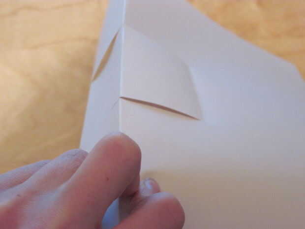 5. Abra para arriba como en la foto, pasar la tapa y cerrarla, asegurándose de que la aleta está del lado de la tarjeta que será visible cuando está abierto.