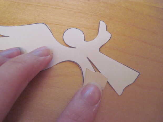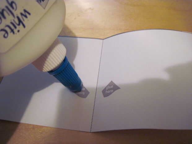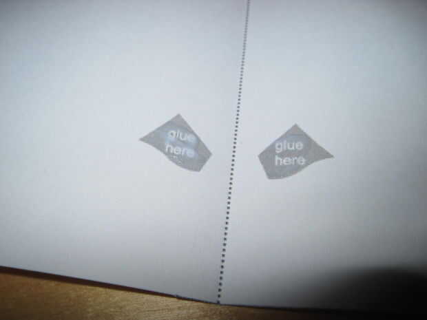 7. poner pegamento en las partes que dicen pegamento aquí y, levantando el vestido del ángel un poco, introduciendo las lengüetas que usted mentó en los pasos 3 y 4 en las zonas pegadas.
