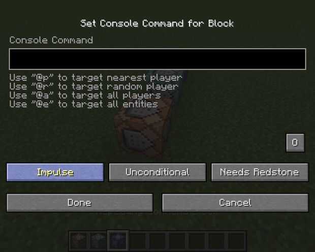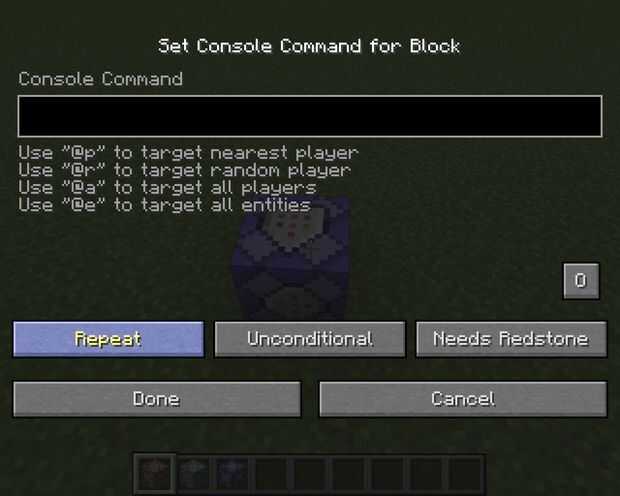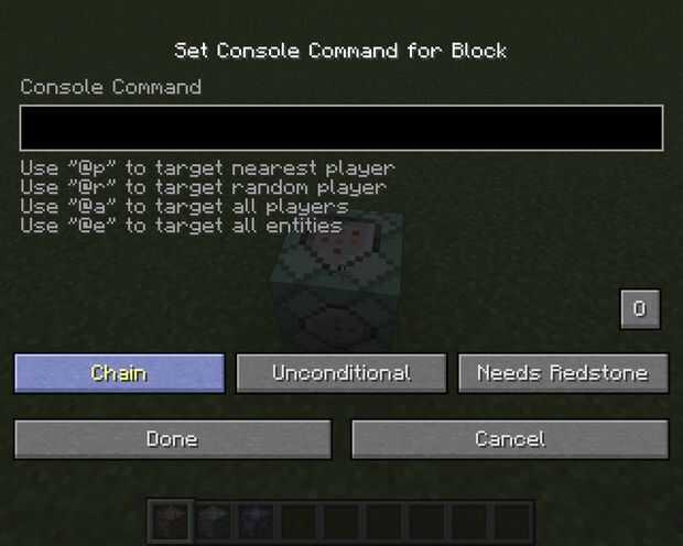 A continuación puede dejar su bloque de comando como impulso o cambiarlo a una cadena o un bloque de comando repetir. Hacerlo haciendo clic en el botón de arriba a la izquierda, como se muestra arriba. A menos que lo dejaste como era, cambiará de color haga clic en hecho.