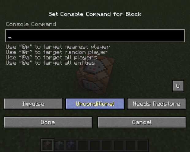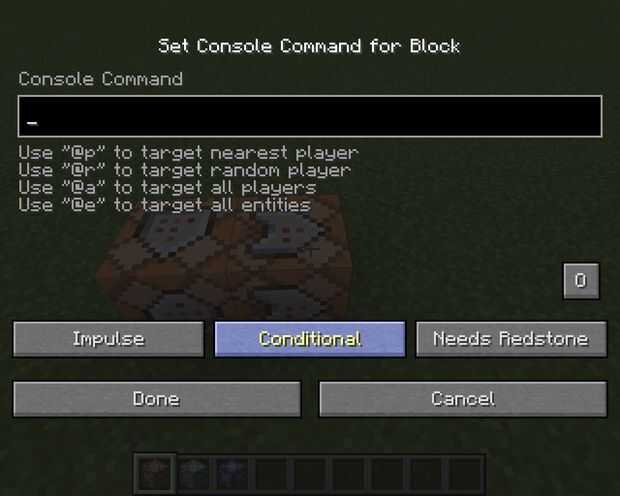 Bloques de comandos condicionales son casi como los bloques de cadena de comando, pero son aún diferentes. No es necesario un bloque de comando hacia ellos, pero se ejecutará una vez que se ejecuta el comando bloque directamente detrás de ellos con éxito.