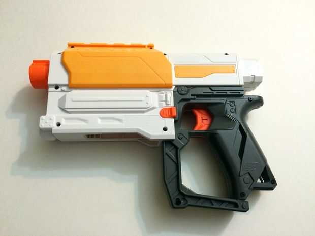 pistola Nerf A es, simplemente, una pistola de juguete de plástico que dispara espuma dardos. Sin embargo, el arma no es tan fuerte lo suficiente como nos gustaría, y fuera de caja, realiza en ninguna parte cerca de su capacidad. Hasbro ha instalado