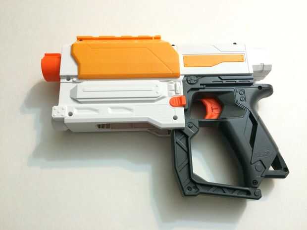 pistola Nerf A es, simplemente, una pistola de juguete de plástico que dispara espuma dardos. Sin embargo, el arma no es tan fuerte lo suficiente como nos gustaría, y fuera de caja, realiza en ninguna parte cerca de su capacidad. Hasbro ha instalado