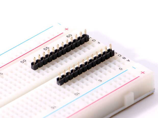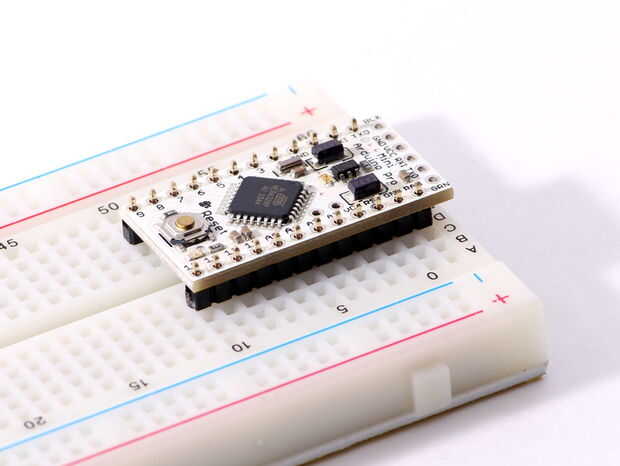 soldar las cabeceras rectas a nuestro Mini Pro. La forma más sencilla de hacerlo es poner los encabezados en el protoboard con el espacio correcto para que coincida con el Mini Pro. Muchas personas tienen miedo de hacerlo, con el temor de la fusión de la placa. Me parece que es muy difícil de fundir la placa al soldar de esta forma, a menos que pasan demasiado tiempo en uno de los pines. También asegura que las cabeceras son rectas y se enchufa fácilmente dentro y fuera de la Junta.