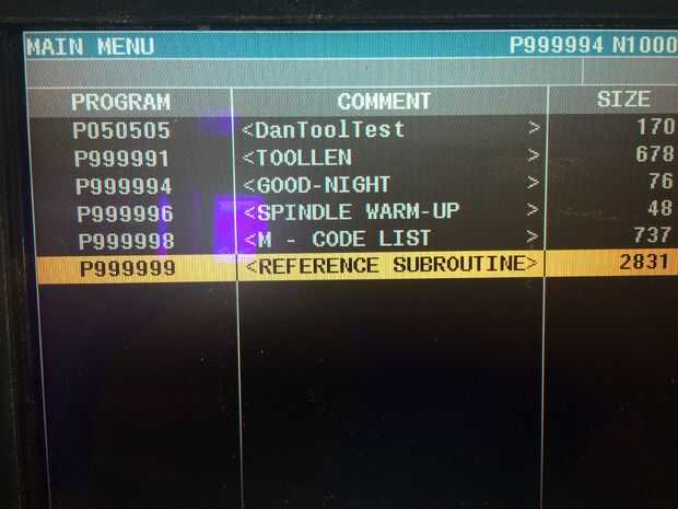 Cuando la máquina ejecuta un cambio de herramienta, se ejecuta un programa interno que contiene movimientos de máquina específica para dejar y recoger a una herramienta. Este programa se destaca en la foto de arriba, SUBRUTINA de referencia P999999. Estos programas sólo deben ser modificados por personal de la tienda.