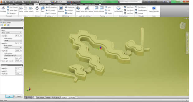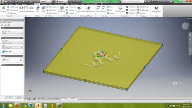 En general, que desea establecer sus WCS (indicados por la x, y, tríada z) encima de su stock, en una esquina. Sin embargo, sabía que sería ser fresado en una hoja grande de corian, así que puse mi stock dimensiones a 20 "x 20" x 0.5 "y mi WC sobre el stock en el centro de la parte. La razón de no hacer sólo un poco más grande de mi parte fue porque a veces el software enviará automáticamente la fresa al lado de la culata, donde piensa hay sólo vacío, mi acción por la penetración de la fresa en velocidad rápida y luego mover lateralmente.