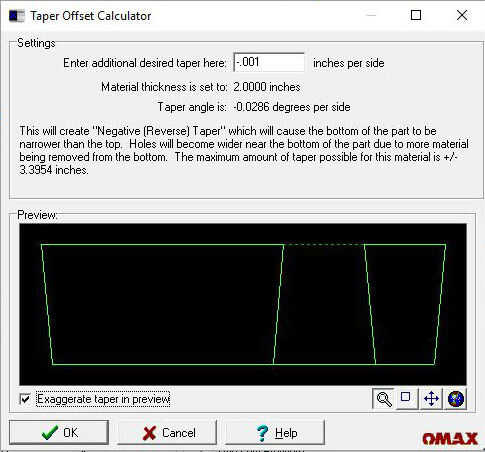 - En el pop-up ventana usted puede elegir definir la forma cónica compensada por pulgadas