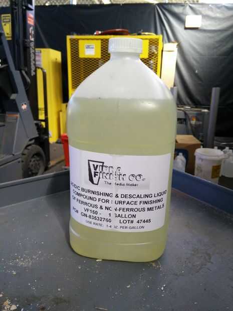 El compuesto de pulido que tenemos en el muelle 9 es Vibra final VF 150, una mezcla ligeramente ácida con inhibidores de óxido para impedir la oxidación de acero. Tendrá aproximadamente 1,5 onzas de VF 150 por galón de agua.