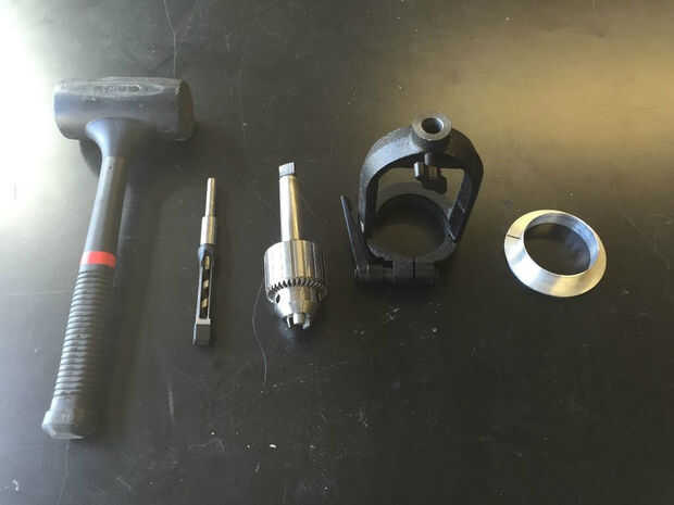 Las herramientas que necesitarás para completar esta operación se encuentran sobre todo dentro de un cincel para escoplear "kit". Aquí en el muelle nuestros es un poco diferente que he hecho un collar especial para adaptarse a nuestro taladro específico (especial). Los kits suelen ven con una serie de collares que trabajan con Taladradoras más fácilmente disponibles.