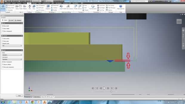 7. en la ventana de gráficos, en cuenta que el corte extra pasa en cualquiera de los extremos de nuestra parte. Estas pasadas adicionales son la manera más segura a la acción irregular de la máquina. Recuerde, una vez que cortamos nuestro material común en la sierra debemos medir y actualizar Setup1 X, Y & Z dimensiones en consecuencia.