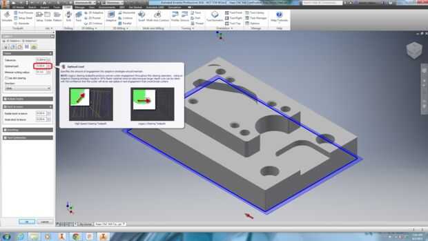 Nota: La carga óptima es la carga máxima (o fuerza) creado por la trayectoria de compensación adaptativa 2D. Este parámetro es la máxima fuerza que se encontrará con la herramienta. Sé un valor alrededor de 0.05 en parece bajo, pero para grandes 1 pulgada fresas nuestro molino de Haas VF2 no tiene suficiente potencia. Nos hemos roto un montón de molinos de extremo de 1 pulgada con valores mayores a 0,05 pulgadas y esas herramientas son caros ($400!).