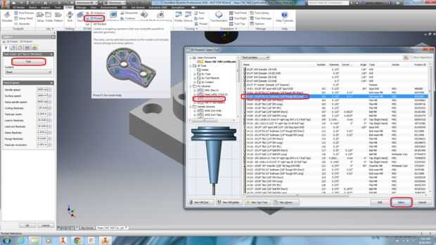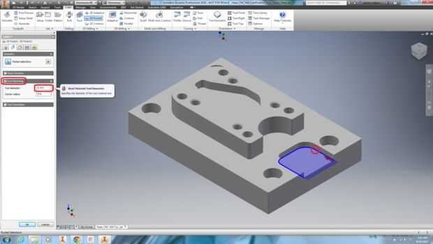 Nota: Este parámetro es confuso. Diámetro de la herramienta es el diámetro de la herramienta anterior para el bolsillo abierto de la máquina. Este valor, combinado con la herramienta seleccionada para esta operación, 1/8" áspero EM corto, permite que el software calcule la diferencia entre el bolsillo abierto del unmanchined y el bolsillo abierto parcialmente mecanizado con la herramienta anterior (es decir, restar lo que fue cortado con la herramienta anterior de bolsillo abierto sin cortar). Con esta información, el software crea una trayectoria de herramienta para mecanizar el material restante.
