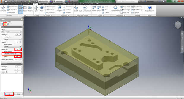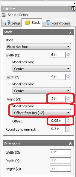 Nota: Por defecto, stock material rodea uniformemente la parte. Las dimensiones comunes son: 6 "x 4" x 1.5 ". Materia prima es generalmente más gruesa, por lo que nuestra dimensión z es 2 pulgadas en lugar de 1.5 pulgadas.