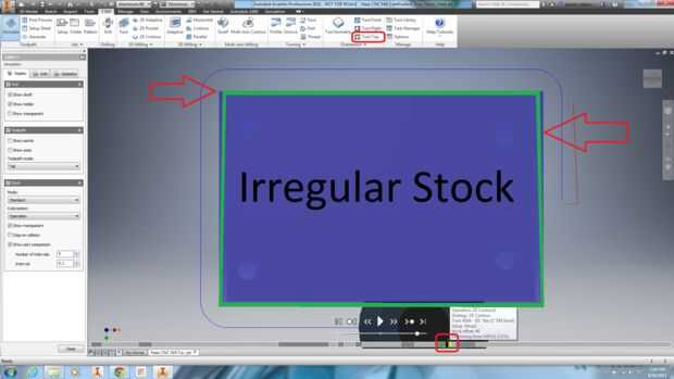 Con una visión clara de la parte inferior de la parte la simulación muestra stock con bordes cuadrados. Este no el caso y las líneas verdes en la imagen de arriba son la geometría real (es decir, la acción no era cuadrada con debido a la sierra). En la anterior configuración, configuración de 2, colocamos el WCS en la esquina de la materia prima de la parte trasera de nuestra parte. Esto estaba bien porque fue utilizado para la máquina salientes y la cara (características X e Y no se mecanizan en configuración 2).