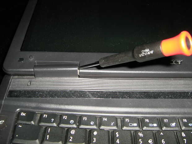 Antes de separar el plástico de la tapa, cierra su laptop y dale la vuelta. Hay cinco tornillos en la parte inferior, justo debajo de la bisagra. Los tres medios son los únicos que usted necesita quitar; Sostenga la cubierta de la bisagra / botón de encendido / luz de montaje en el lugar. Pop la manera más fácil es abrir la pantalla, dejando todo el camino de vuelta, luego con cuidado haga palanca como se muestra en la imagen dos. Una vez, usted será capaz de ver donde el cable del LCD se conecta a la placa base, en el lado izquierdo.