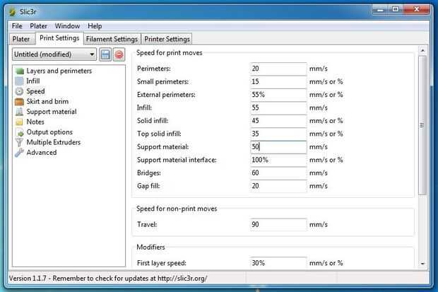 Haga clic en la categoría de "Velocidad" en la ficha "Configuración de impresión" mediante los consejos anteriores y la imagen de mi configuración habitual, trabajo a una buena velocidad para su modelo. Recuerde, si usted quiere más detalle y calidad, ir más lento.
